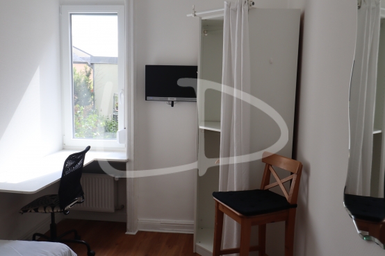 La chambre est meublée d'un lit avec matelas, un bureau avec chaise, des rangements et d'une télévision avec chaînes Satellite.